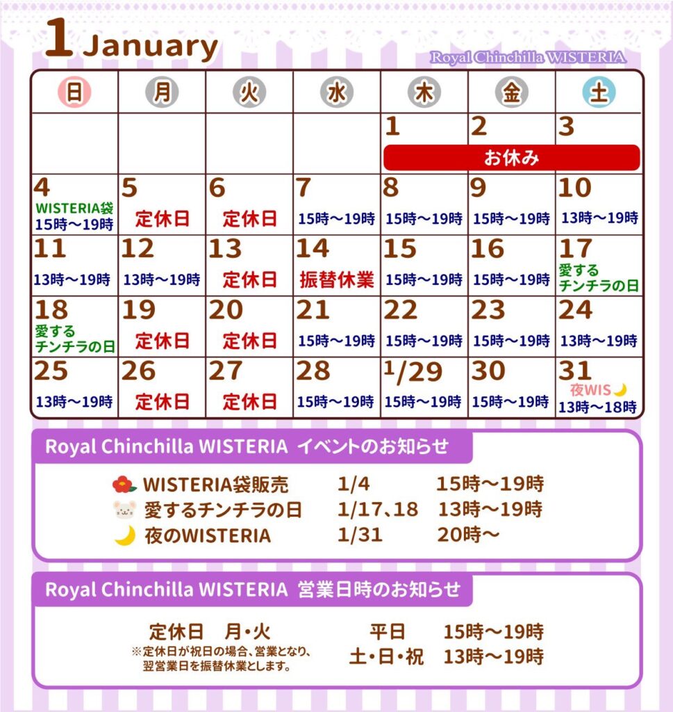 ロイヤルチンチラWISTERIAは1月12日(月)は祝日営業し、その振替で14日(水)は休業いたします。